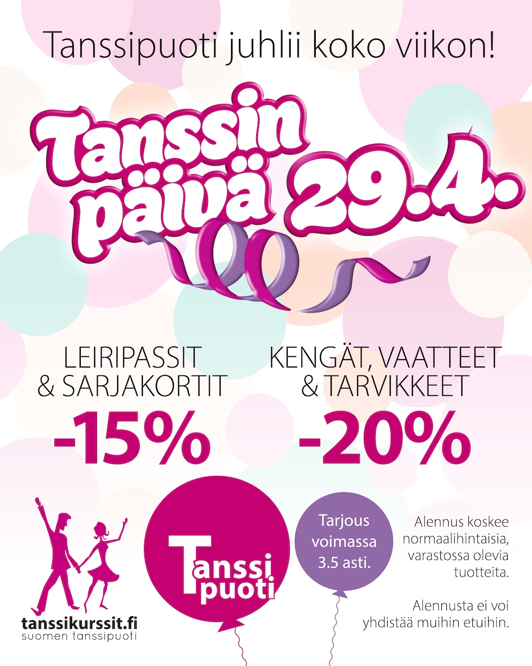 Tapahtumissamme pääset huippuammattilaisten tunneille ja iskelmätaivaan eturivin artistien tansseihin. Olet tervetullut mukaan menoon yksin, parin kanssa tai porukalla, kun sinulle sopii.