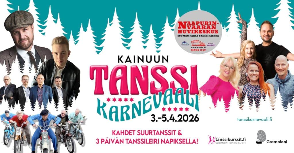 Jo neljättä kertaa järjestettävää Kainuun Tanssikarnevaalia vietetään Vuokatissa pääsiäisen aikaan huhtikuussa 2026. Tapahtuma sisältää kaksi iltaa lavatanssin riemua livemusiikin tahtiin ja kolme päivää tanssitunteja huippuopettajien johdolla. Tällä leirillä tunteja löytyy niin vasta-alkajille kuin opetettavien lajien perusteet hallitseville ja pitempään tanssineille!