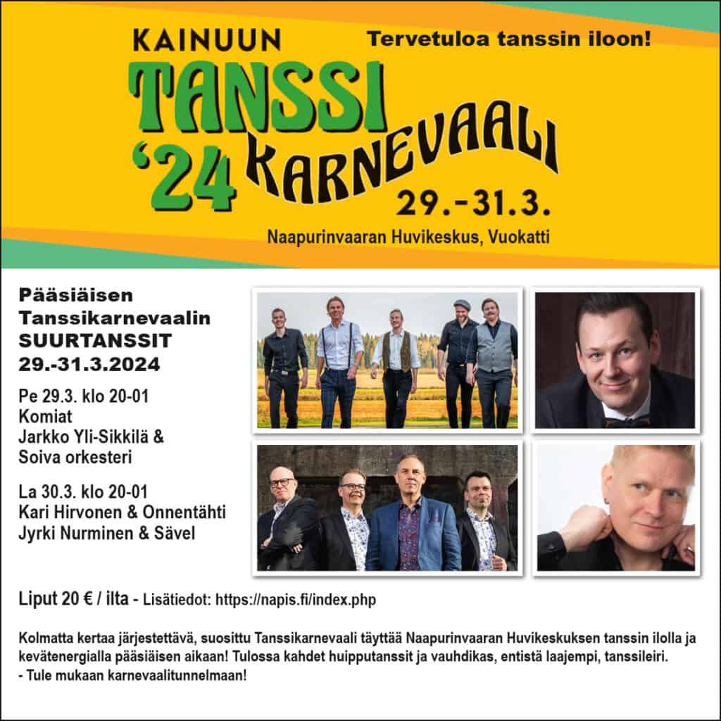 Livemusiikin ja tanssin värittämä viikonloppu alkaa Napiksella pitkäperjantaina. Kainuun Tanssikarnevaalia vietetään 29.-31. maaliskuuta ja esiintymislavalle saadaan mittava esiintyjäkaarti – perjantaina 29. maaliskuuta Komiat sekä Jarkko Yli-Sikkilä & Soiva Orkesteri. Lauantaina 30.3. on vuorossa Kari Hirvonen & Onnentähti sekä Jyrki Nurminen Sävel-orkesterinsa kanssa. Tanssileiri järjestetään perjantaista sunnuntaihin ja mukana suositut tanssinopettajat Anniina Koivuniemi, Matti & Sannu Heikkilä, Arto Petjala, Jenna Polvi ja Tapani Hasa. Pääsiäisenä voi tulla tanssiman vaikka koko viikonvaihteeksi tai vaikka vain yhdeksi päiväksi. Kainuun Tanssikarnevaali valmistautuu jälleen tarjoamaan yleisölle kaikenkattavaa ajanvietettä, joka sopii erityisen hyvin käsillä olevaan kevään suosittuun loma-aikaan.