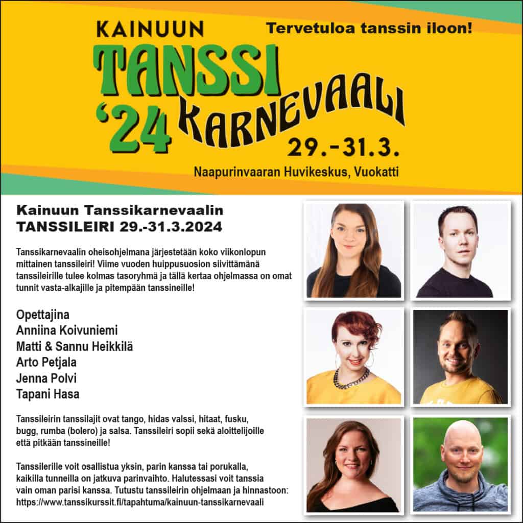 ”Tanssileiri laajenee tänä vuonna kolmannelle parketille suuren suosion ja yleisön toiveiden vuoksi. Nyt voimme ensimmäistä kertaa tarjota omat tunnit myös aivan aloittelijoille koko tanssileirin ajan. Lisäksi ohjelmasta löytyy tietysti omat tunnit harrastajille ja pitempään tanssineille huippuopettajien johdolla” iloitsee Tanssikarnevaalin tanssileiristä vastaava Niina